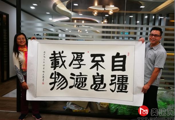 (TGV公司总部位于马来西亚吉隆坡,是马来西亚唯一且东南亚规模最大的现代化印度白檀种植企业。)2016年11月17日,邵天榕老师又再次应马来西亚TGV公司邀请,专程赴吉隆坡为TGV公司举办的绿色世界慈善晚会及绿色天使选美大赛(马来西亚一年一届)精心创作书法作品,并当晚捐献给绿色慈善晚会。在捐赠仪式上,当邵天榕老师的《百年树人,十年树木》的书法作品展现在晚会现场时,现场八百多名嘉宾给予热烈掌声,为著名女画家邵天榕的篆书书法所震撼,所感染。她为中国传统文化在世界传播尽自己最大的努力。