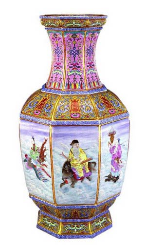 乾隆朝是古代最为繁荣富庶的朝代,当时的工艺品极尽工巧,装饰风格追求全满,具有“无物不吉利,无语不吉祥”的特点。嘉德2006春拍,一件乾隆粉彩开光八仙过海图盘口瓶以5280万人民币成交。此器为乾隆官窑器,瓶身装饰图案富丽华贵,构图繁密,瓶颈部绘粉彩盘结、磬、缨络纹寓意“福寿吉庆”,瓶腹八面开光内绘“八仙过海”图,这些显然都是为了取悦乾隆皇帝而精心构思的。既是皇帝御用瓷器又有非常吉祥的图案装饰,这都决定了它的不菲身价。