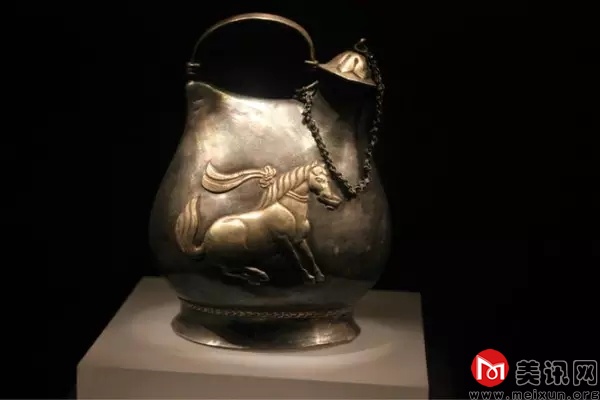鎏金舞马衔杯纹银壶,唐朝的文物,1970年窖藏出土于陕西省西安市南郊何家村,高14.8厘米,口径2.3厘米。现收藏于陕西历史博物馆。马身和提梁、壶盖及“同心结”纹带均鎏金,使得银壶富丽堂皇,明快悦目。该壶构思巧妙,工艺精细,古今未见类同者,堪称国宝。